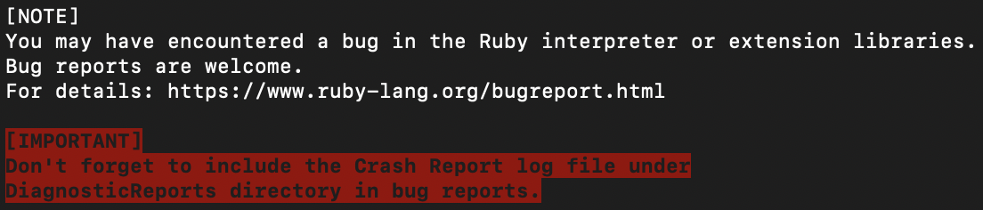 내용은 루비 인터프리터 또는 확장 라이브러리에서 버그 발생이라는 건데, 일단 구글링으로 해결법을 찾아봤습니다.